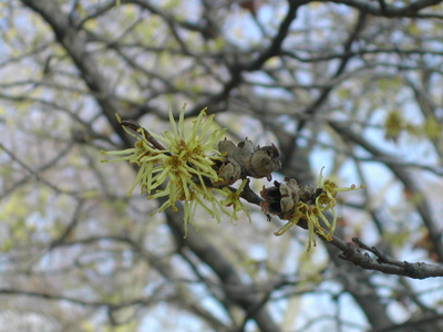Both plants have seed capsules in the Summer. But there are big differences in size (hazelnuts are much bigger) and methods of distribution. Hazelnuts rely on mammals and birds to disperse their nuts. Witch hazels eject their ripe seeds from the shell with great force in early Autumn. The seeds shoot out with an audible “pop” and land up to 30’ away. The sounds of that popping throughout the woods of eastern North America led the colonist to think of these New World shrubs as bewitched hazels. Common speech shortened it to witch hazel and the name stuck.